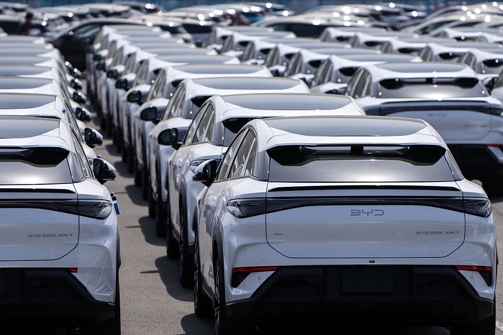 Imported BYD vehicles are parked at a port on March 27, 2025 in Yokohama, Japan.