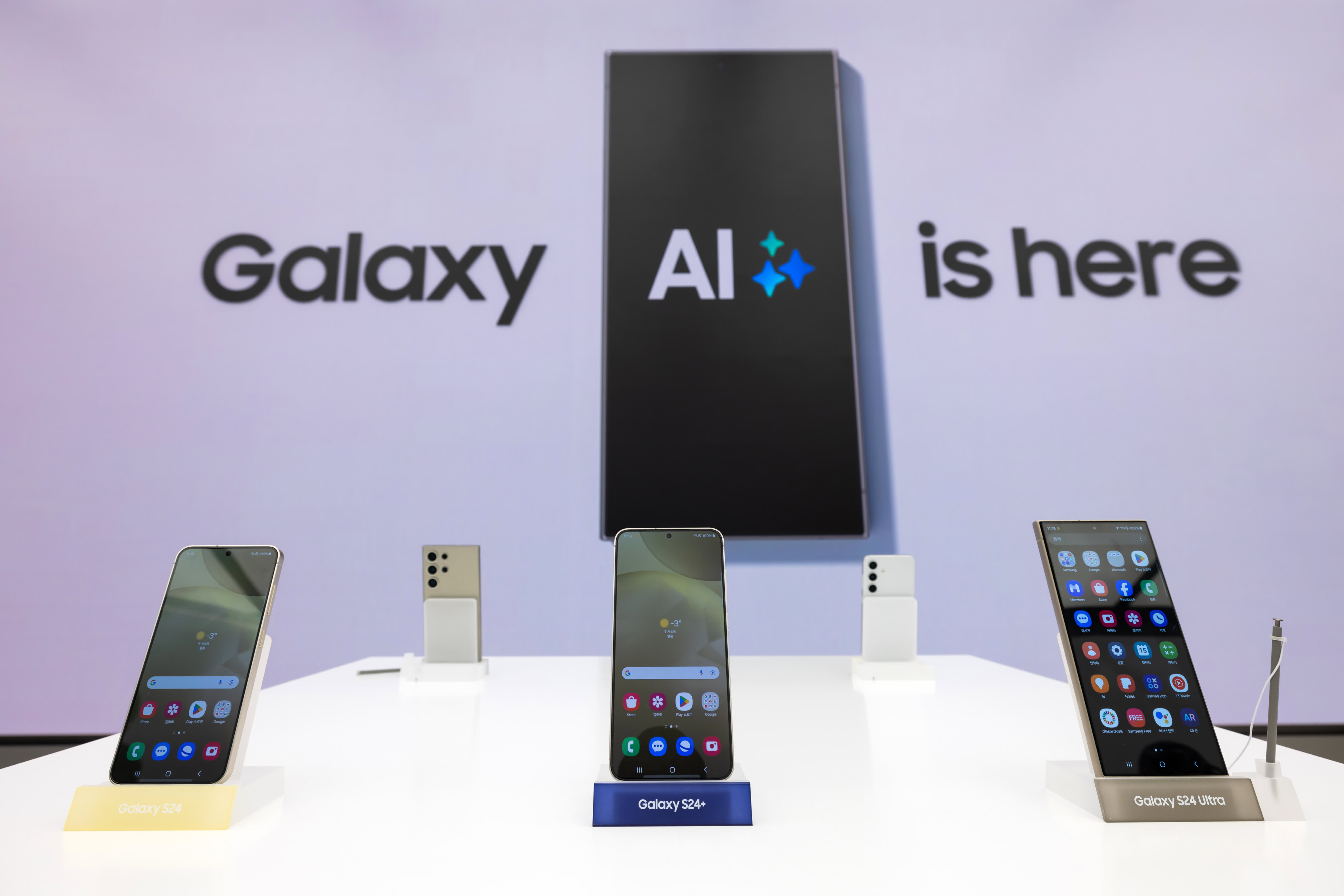 Samsung Electronics Co. Galaxy S24 smartphones during a media preview event in Seoul, South Korea, on Monday, Jan. 15, 2024. Samsung, the world’s most prolific smartphone maker, is leaning into artificial intelligence as the key to unlocking greater sales this year. Photographer: SeongJoon Cho/Bloomberg via Getty Images